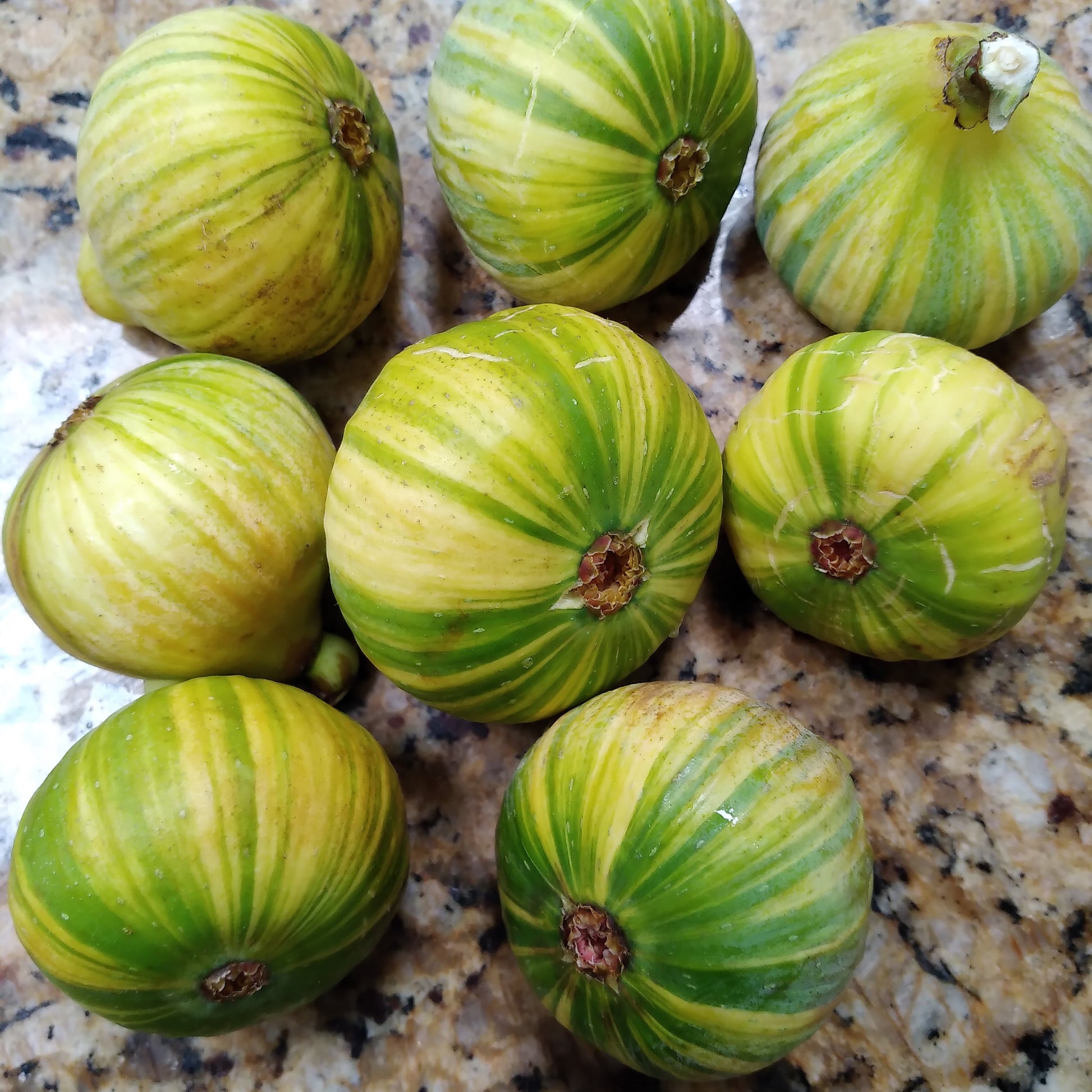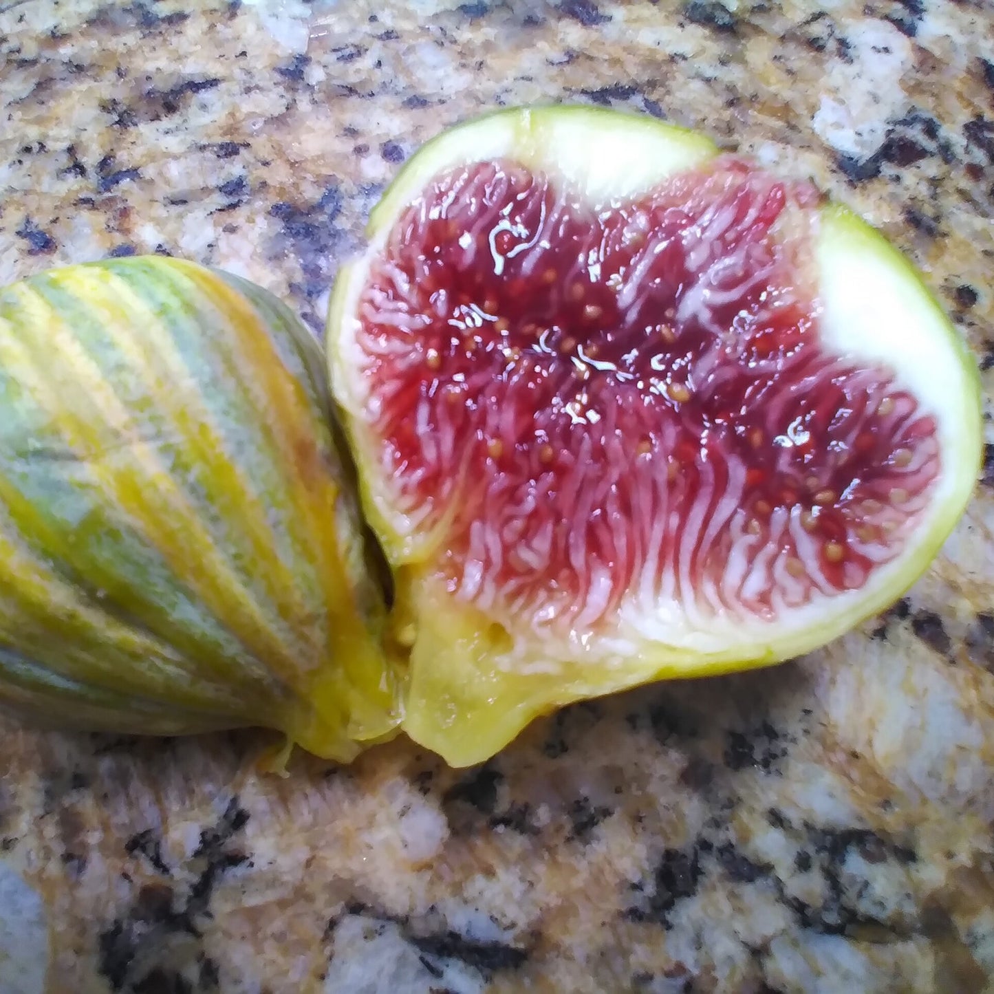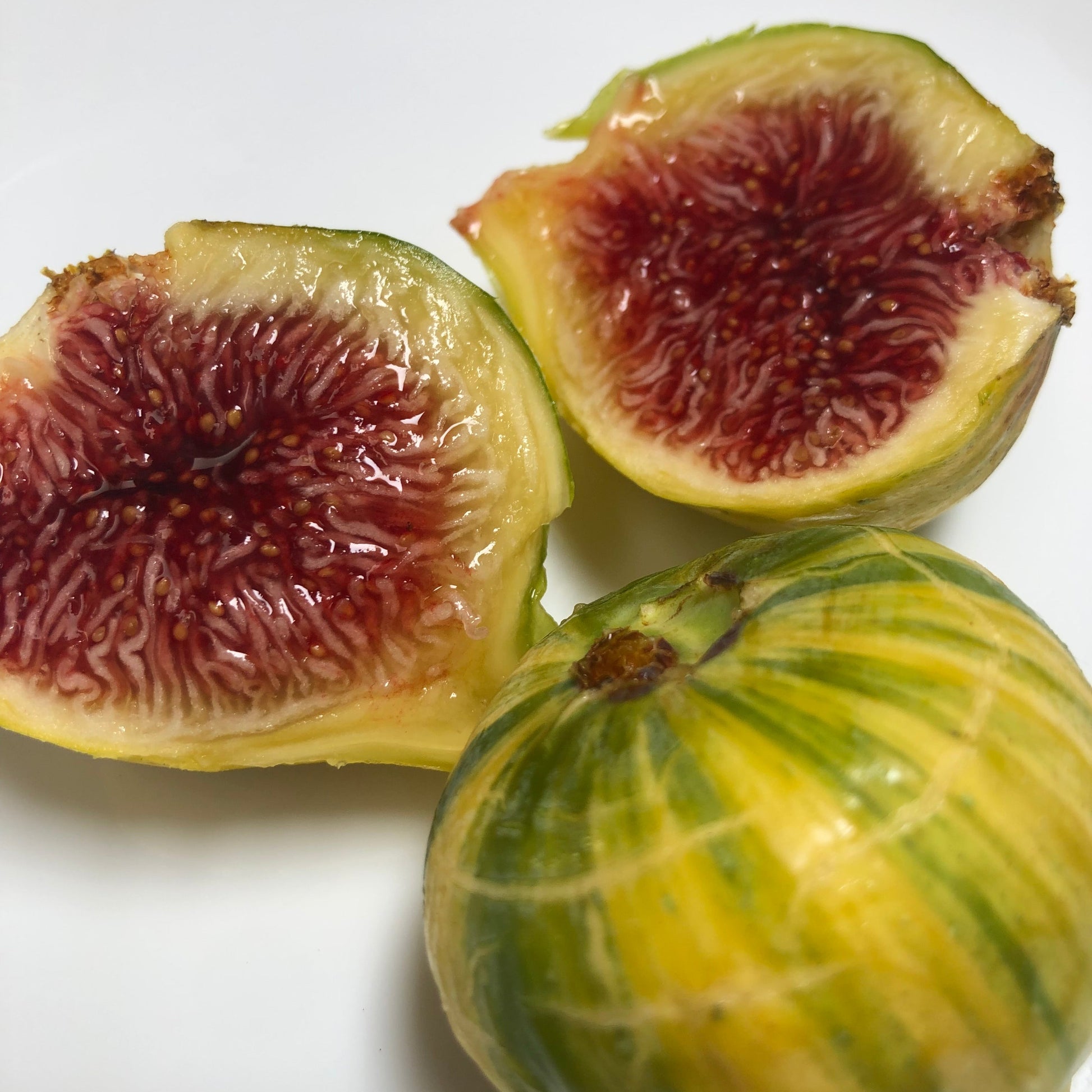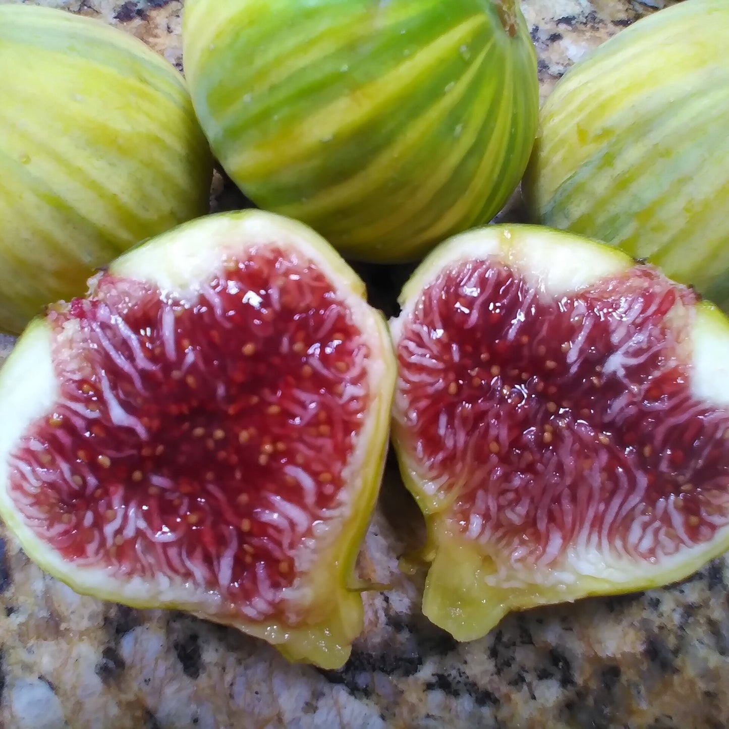 The Panache Fig, aka Tiger Striped Fig variety produces beautiful Yellow / Green Striped figs with a deep red jammy interior and delicious sweet strawberry jam flavor. Self fertile or common fig variety, which does not require the fig wasp pollination to produce ripe figs. This listing is for one Tiger Fig tree in a 1-quart pot.