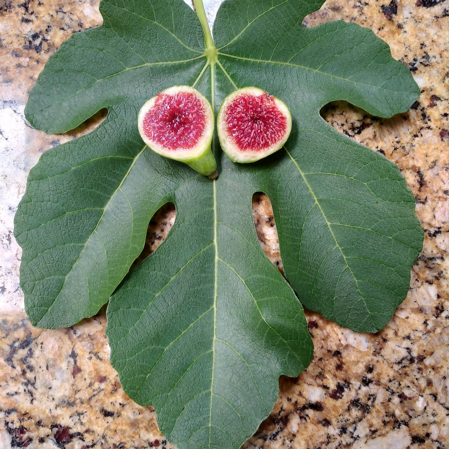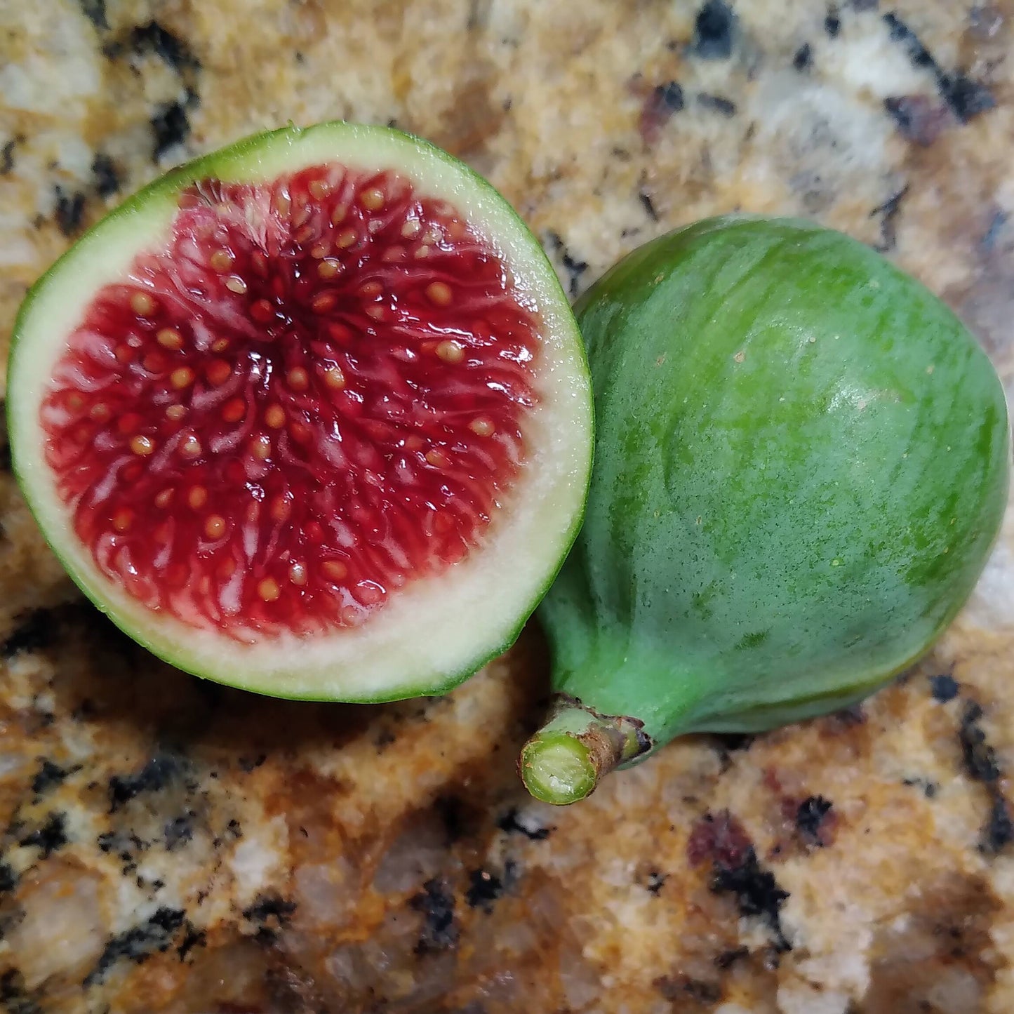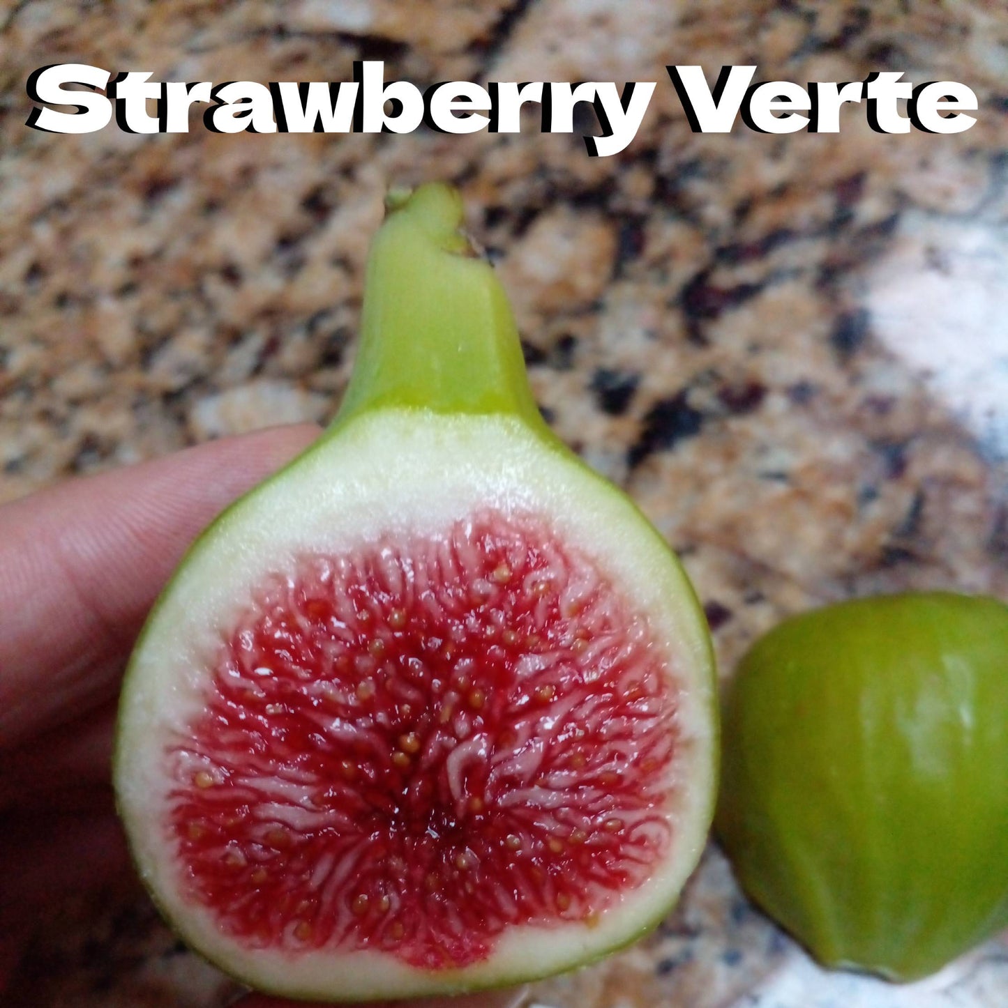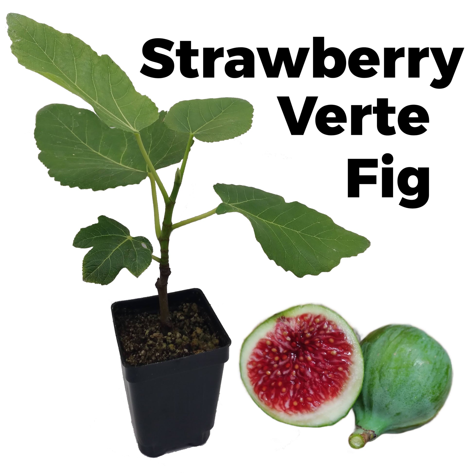 The Strawberry Verte Fig variety produces tasty green (verte) figs with a strawberry red jammy interior and sweet berry flavor. This is a self fertile fig variety aka common fig, which does not require fig wasp pollination to produce ripe figs. This is a top-tier fig variety that taste very similar to White Madeira #1. This listing is for 1 Strawberry Verte Fig Tree growing in a 3.3-inch pot.